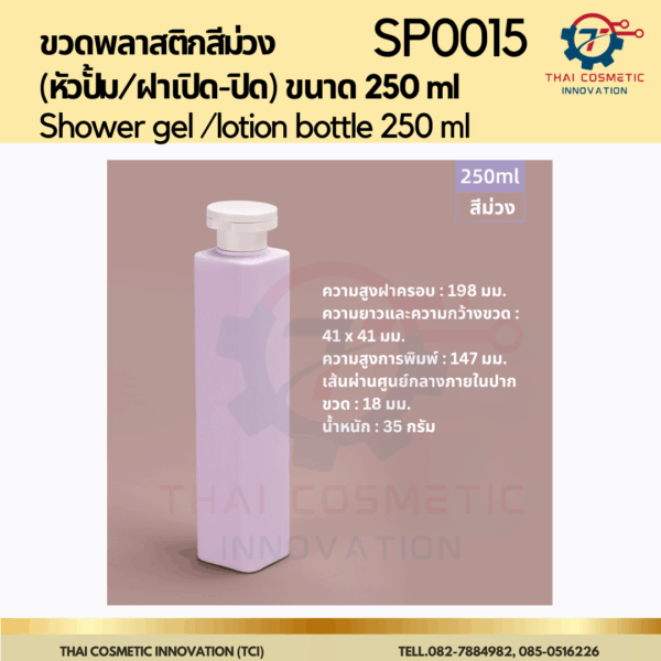 ขวดพลาสติกสีม่วง (หัวปั้ม/ฝาเปิด-ปิด) ขนาด 250ml ราคา 20 บาท/ขวด